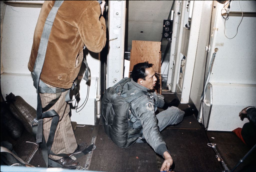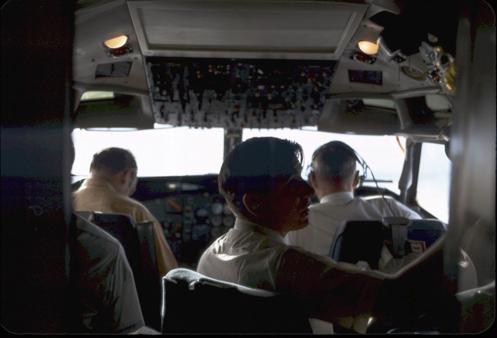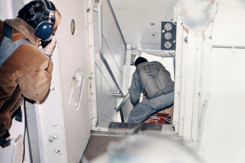Flight Engineer Harold Anderson occupies the same seat he did on the night of the hijacking. The pilot is Paul Soderlind, co-pilot is Eric Linden, and in the jumpseat is Captain Thomas Spangler.