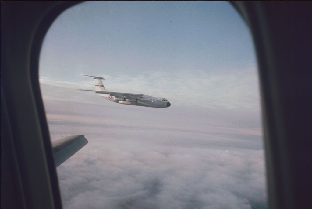 An Air Force C-141 trails alongside the 727, preparing to record video of the Sled Test.