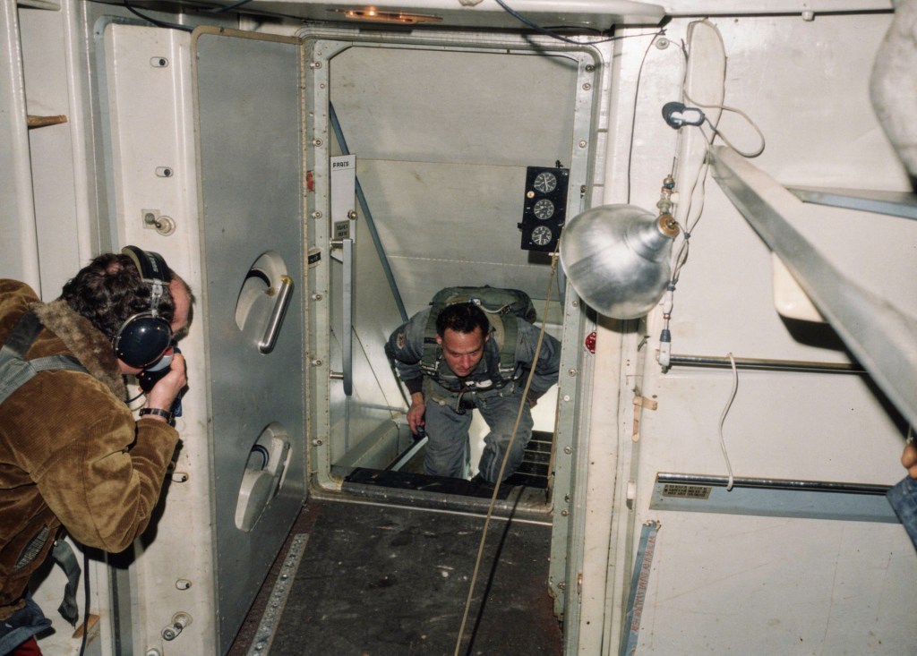 Captain Ronald Wilson stands at the bottom of the stairs. His goal was to determine how far the stairs would lower from a man’s body weight. He reported that Cooper would have been able to stand at full height while at the bottom.