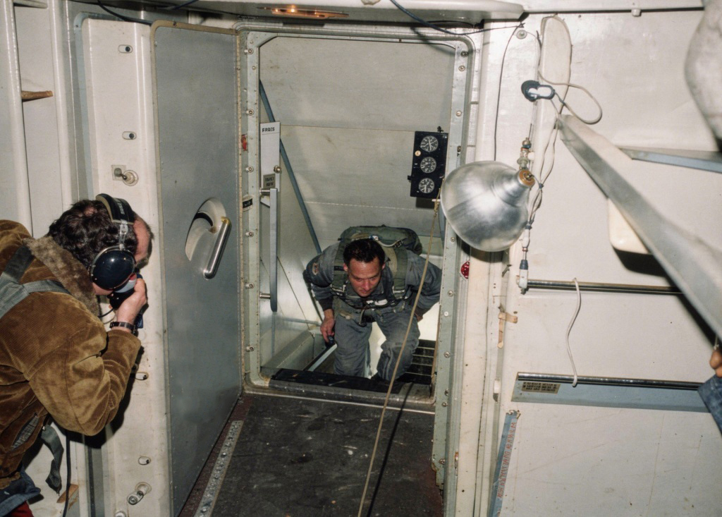 Captain Ronald Wilson stands at the bottom of the stairs. His goal was to determine how far the stairs would lower from a man’s body weight. He reported that Cooper would have been able to stand at full height while at the bottom.