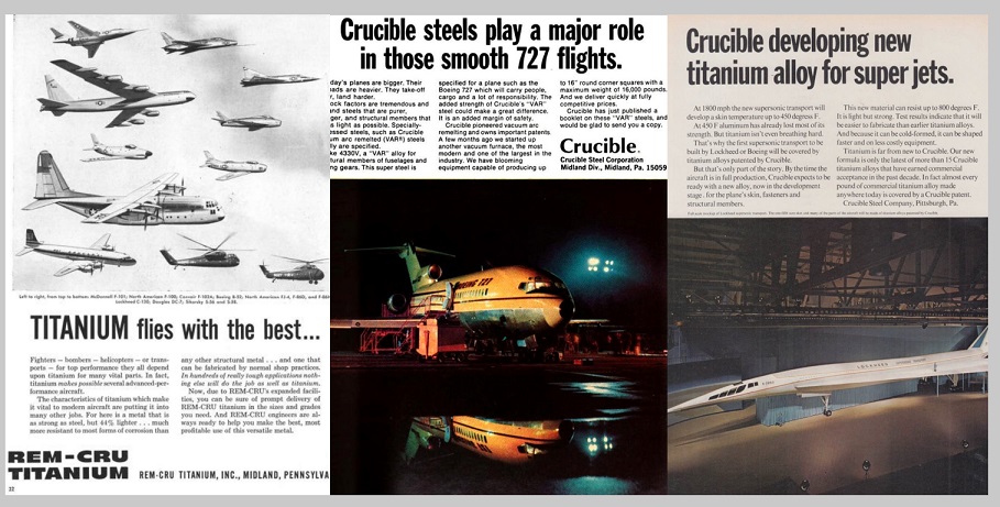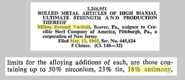 One of the only places that attempted to make TiSb alloys with a high percentage of Sb during the 1950’s was a company in Pittsburgh called Rem-Cru. This company was a leading supplier of titanium products to the Air Force as well as to the commercial airline industry and the Aerospace sector. Their products were crucial in the development of the C-130, the 727, and even the SR-71. They had several research-metallurgists at Rem-Cru but the primary metallurgist who was known to be experimenting with TiSb was Milton Vordahl. Of all the TiSb patents produced by Rem-Cru, Vordahl was the only employee named on them. Because TiSb alloys were so difficult and inefficient to produce, by the late 50’s the metals industry had virtually stopped any experimentation of TiSb alloys and had moved on to alloying titanium with tin instead of antimony.