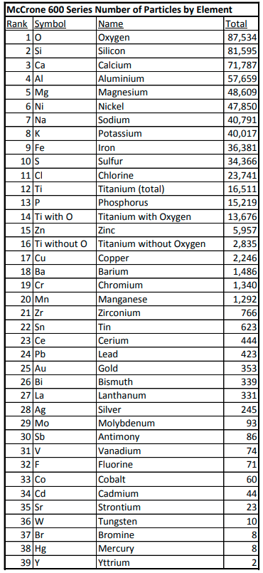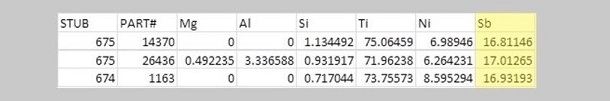 This list of particles were then transferred to a spreadsheet and released publicly. So, any researcher with enough knowledge (and time) to go through 100,000 spectrums was free to do so. Three of these 100,000 particles stood out like a sore thumb and Cooper-researcher Eric Ulis spotted them. They appear to be metal alloys that have a unique combination of titanium and antimony. These two elements, titanium and antimony (hereinafter called “TiSb) were occasionally mixed together in the 50’s by a few research labs working for steel companies, but these alloys were rarely used commercially as the creation process was difficult and inefficient, especially when the antimony percentage of the alloy went higher than 10%.