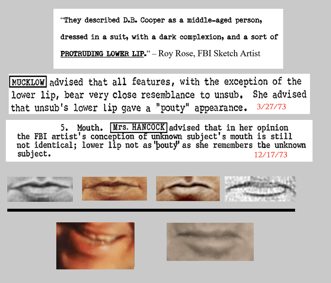 – When asked by the sketch artist to describe Cooper, the stewardesses could only describe one thing that was unique about his face. They said he had a protruding lower lip. Two of the stewardesses called it “pouty”. The sketches all show this very unique feature that many have never noticed with D.B. Cooper. The farthest right “mouth” you see is from a 1989 Unsolved Mysteries episode where former stewardess Florence Schaffner was asked to assist in the creation of a new Cooper sketch. 18 years after the incident she still remembered Cooper’s unique pouty lip.